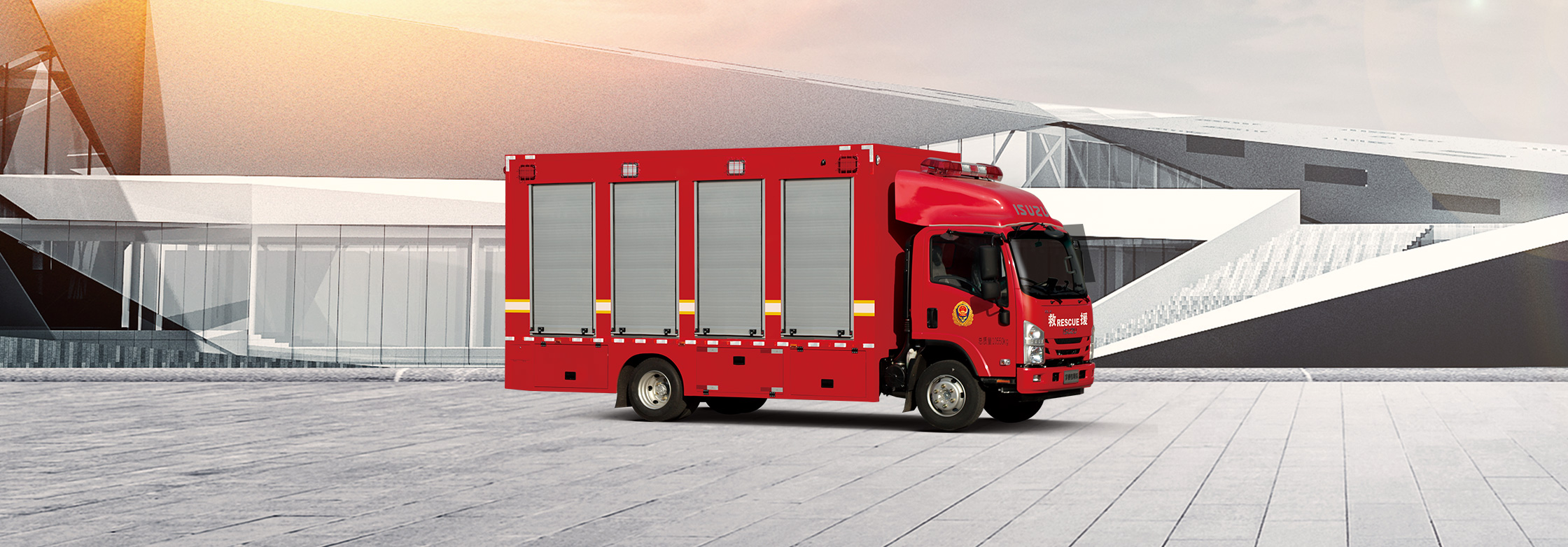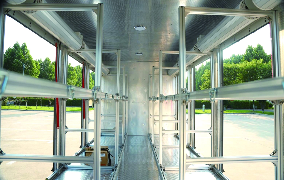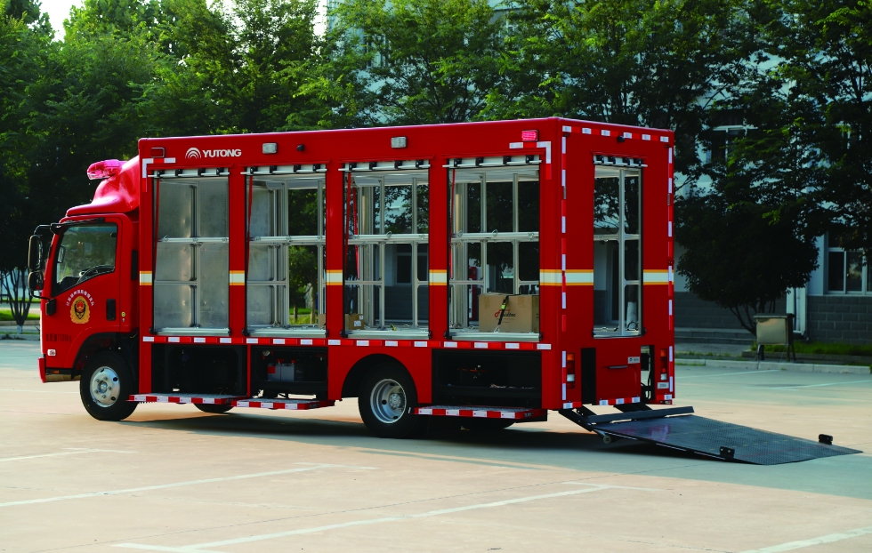 厢体设置铝合金卷帘门及旋转踏步,厢体后部设置卷帘门和液压尾板,以方便在各方向上下车、存取物资。厢体内顶设置LED长条照明灯,厢体外部设置照明灯,方便夜间器材的运输、装卸车等。