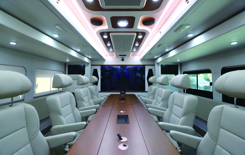 宇通牌通信指挥消防车采用大型客车平台改制,车辆设置会议会商指挥区、运兵宿营保障区,分区独立设置。会议区配备卫星通信、办公会议系统等,运兵宿营保障区设置可转换床铺座椅、卫浴间等设施。
