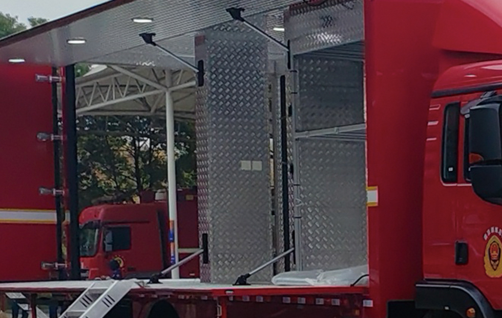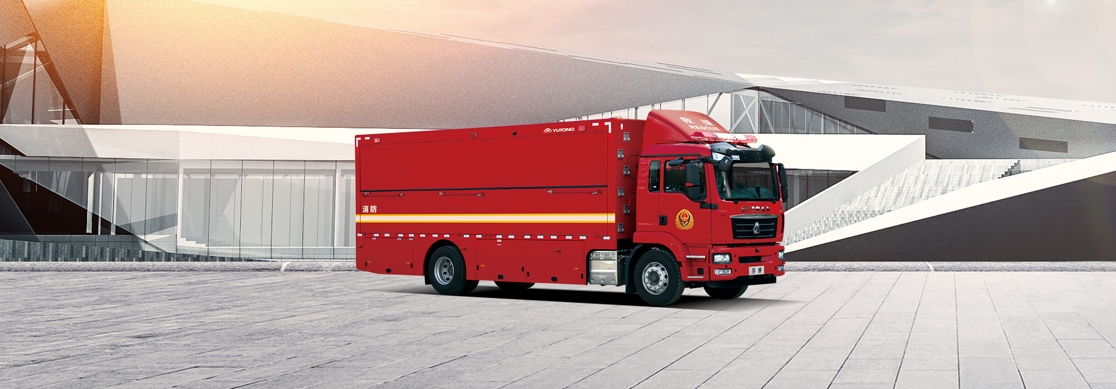 宇通牌器材消防车采用汕德卡底盘改制,动力强劲。整车由加强型厢体、电气系统、铝制货架液压尾板等组成,可满足救援装备快速转运等需求。