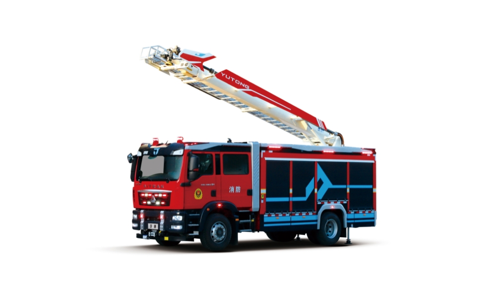 宇通牌PM45多功能城市灭火消防车具有举高救援、举高灭火、举高照明、前车牵引、外供发电、吊重、液压破拆等功能,还能独立开展侦检、破拆、救生、堵漏、排烟等多种抢险救援工作。车辆融合抢险救援车、水罐泡沫车、高喷车等功能,一车多能。